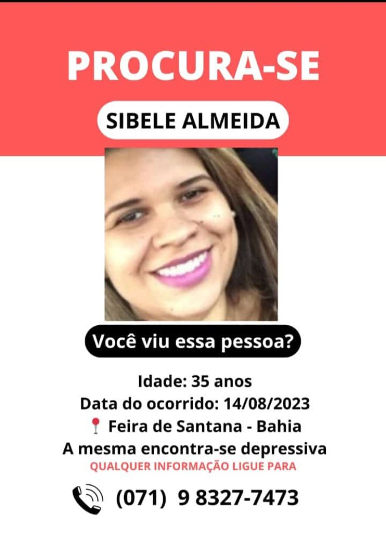 Quem tiver mais informações sobre o paradeiro de Sibele Almeida Santos pode entrar em contato pelo telefone (71) 98327-7473 ou ligar para a Polícia Militar por meio do 190.
